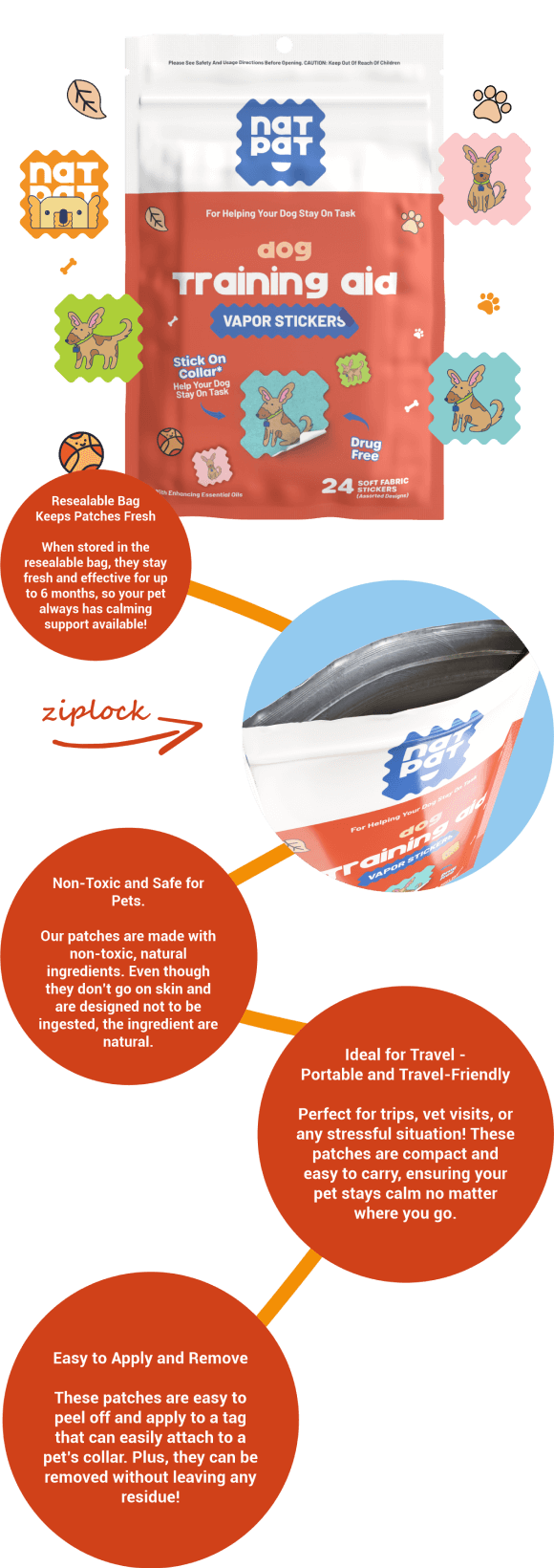 Simply peel and stick the patch to the training locket provided, then attach it to your dog’s collar or harness. No sprays or ingestion required.